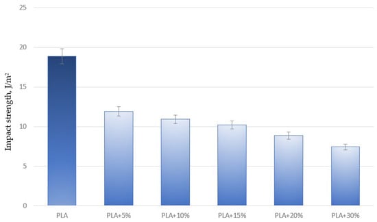 The next stage in the assessment of the mechanical properties of the obtained composites was impact strength testing. The results are presented in Table 4 and Figure 4.