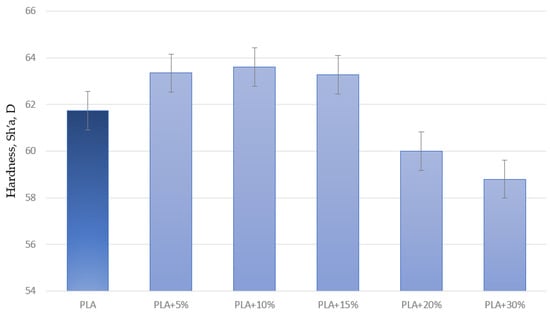 As the amount of cork filler in the PLA matrix increases, the hardness increases to 15% wt. compared to pure PLA. A decrease in this parameter was observed only at the content of 20% wt. and 30% wt. This type of behavior suggests complex material behavior. It is difficult to talk about a deterioration of this parameter at contents above 20% wt. During such filling, part of the load is already transferred to the cork particles dispersed in the matrix. Because it is more susceptible to compression and deformation and is dispersed in the polymer matrix, the cork particles absorb part of the stress and thus the hardness is reduced.