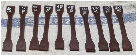 Then, PLA mixtures were prepared with cork content of 5, 10, 15, 20, 30% by weight, respectively. Properly weighted parts of PLA and cork filler were mixed in a drum mixer. Then, preliminary tests were carried out on the injection molding machine and, after correcting the technological parameters of the injection process, test samples were made in the form of standardized paddles for strength tests. It should be emphasized that during the tests, it was necessary to correct the temperature settings in individual zones in the cylinder. During the plasticization process of the plastic with the filler, a significant amount of heat was generated due to friction. Therefore, it was necessary to lower the temperatures in individual zones on the injection molding machine cylinder. The final process parameters are presented in Table 3.