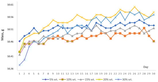 Each time after 24 h, the samples were dried, and their weight was measured. Figure 7 shows the measurement results of the mass change of the tested samples during the experiment. Table 6 shows the final results of the changes in the mass of the samples during exposure to water.