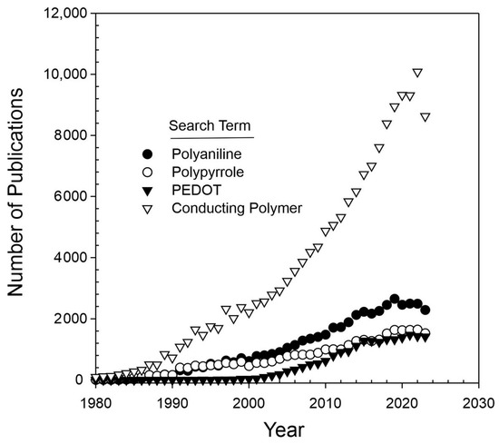 Research into intrinsically conducting polymers (ICPs), first established by the pioneering work of Shirakawa, MacDiarmid, and Heeger in 1977 [1], has intensified in recent times, with polyacetylene being eclipsed by a spectrum of new conjugated systems [2,3,4,5,6,7]. Polypyrrole, polythiophene, polyaniline, and their associated derivatives are the more common of the new variants and are among the few that are stable enough, under normal processing conditions, to be considered for use in a wide range of applications ranging from energy generation and storage to environmental remediation [2,3,4,5,6,7]. There has been a tremendous increase in the production and characterization of these polymers, leading to an extensive library of systems with unique electrical and optical properties. Ironically, polyaniline (PANI) is far from a new discovery, and its preparation was reported in the 1800s by various groups [8]. It is only in modern times that the true potential of the original aniline black has been recognized, and it is increasingly being proposed to be a key component in the design of smart devices. The applications in which it has been applied have included electromagnetic shielding, photothermal therapies, photovoltaic generation and catalysis, energy storage, membrane separation, molecular electronics and memory devices, chemical and biosensing, anti-corrosion coatings, organic light-emitting diodes, and electrorheological materials [9,10,11,12,13,14,15,16,17]. The use of PANI has also taken many physical forms, ranging from films to fibers and nanoparticles, and found extensive use in the formation of composite materials [10,11,12]. The relative significance of PANI systems within the conducting polymer research base is highlighted in Figure 1, where the numbers of peer-reviewed publications citing the common conducting polymers are compared.