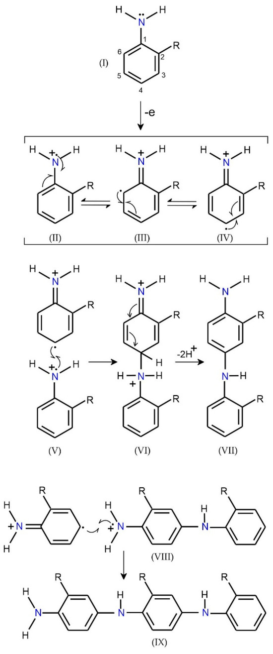The polymerization of aniline or its derivatives (including anthranilic acid) is well documented and initiated by the oxidation of the aromatic amino functionality, leading to the production of a radical cation [89,90]. The generic reaction scheme is shown in Figure 4, where the R group can be either H (for aniline) or COOH (for anthranilic acid). Upon the generation of the radical cation (II), the unpaired electron can be delocalized within the aromatic ring with resonance forms favoring the ortho (III) and para (IV) positions.