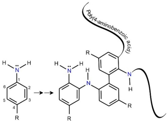 All three aminobenzoic acid isomers (with the COOH group being positioned either ortho, meta, or para with respect to the amino group) have been used as copolymers in PANI systems [74,91,92]. In the case of the 4-aminobenzoic acid (4ABA) isomer, the COOH group blocks the 4-position, thereby impeding head-to-tail coupling, and would be expected to force ortho coupling, which would lead to a much more sterically complex polymer structure, as indicated in Figure 5.