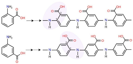 Sarvani et al. (2016) employed 4-aminobenzoic acid not as a homopolymer but rather as an electropolymerizable end cap, which was added to a hyperbranched aliphatic polyester. Here, the 4ABA was the terminating unit at the end of each branch, which could then be oxidized in the presence of aniline to crosslink the polymer chains for use as cellular scaffolds [92]. While the 4ABA derivative leads to the ortho-coupled polymer structure (Figure 5), in principle, it could be envisaged that polymerization of the ortho and meta substituted derivatives would result in chains with near identical chemical structures, as indicated in Figure 6. In both cases, the amino and carboxylate functionalities end up being adjacent (1,2 relative positioning) to each other as a consequence of the head-to-tail coupling process. Although the end chains may be structurally similar, steric issues will undoubtedly arise in the initial polymerization process, wherein the meta substituted COOH could impede subsequent head-to-tail coupling. Benyoucef et al. (2005) found that the meta derivative was more difficult to oxidize than the ortho and was associated with a greater degree of chain branching and shorter chains [24]. The structural consequences of ortho and meta anthranilic acid, however, have yet to be fully clarified [74,91].