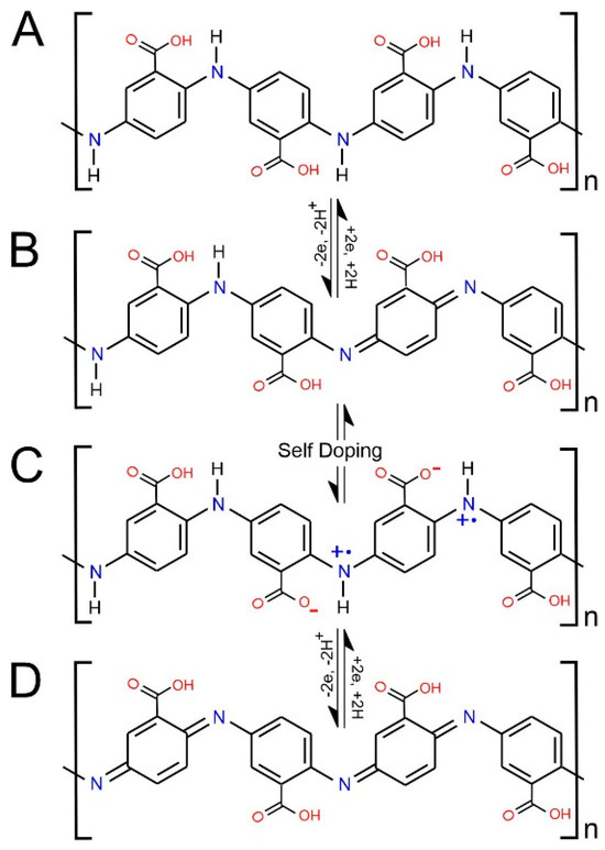 MacDiarmid proposed three idealized types of PANI: leucoemeraldine (fully reduced), emeraldine (half-oxidized), and pernigraniline (fully oxidized) [94]. Among these, the emeraldine form is the most stable and conductive—with the latter being achieved through doping with a protonic acid. Hence, most of the polymerization processes are conducted in the presence of a suitable acid (typically HCl, or H2SO4). While anthranilic acid exhibits these same states, it must be noted that its carboxylate group, in contrast to the case for PANI, enables self-doping [20,24,25,26,27,28,29]. The main transitions between the various states in a PAA homopolymer are detailed in Figure 7.