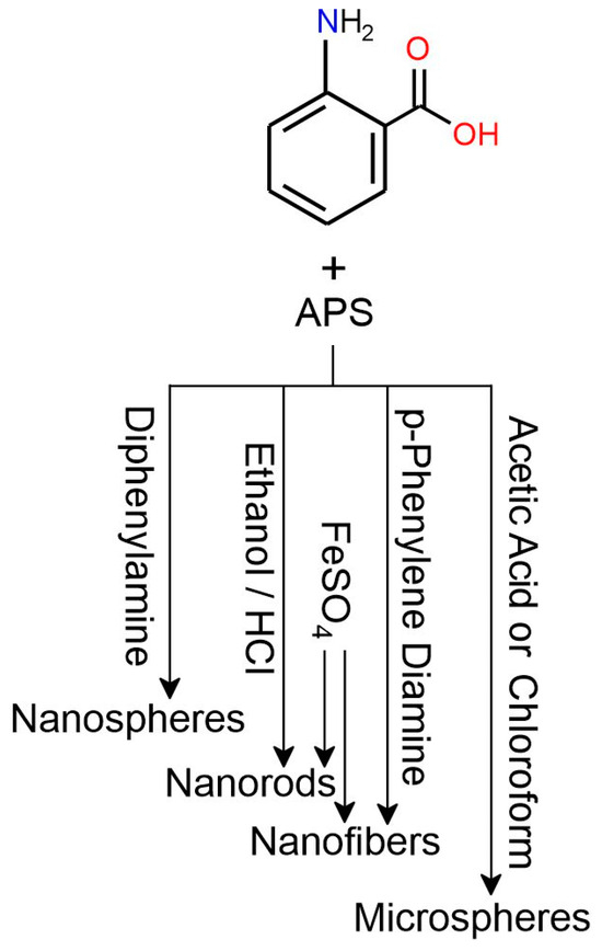 Polymers and copolymers of anthranilic acid have been used to yield a 3D matrix within which nanoparticles can be incorporated. In such cases, a PAA or PANI-PAA hybrid can be utilized as a means of selectively embedding the core ion, which is subsequently converted to the corresponding oxide—usually through thermal treatment [18,55,56,57,58]. This has been performed for a number of metal oxides and is described in detail in Section 4.2. The chemical polymerization of PAA or its copolymers can, however, also be manipulated to yield polymer composite structures that possess nano dimensions. The latter typically include nanoparticles, nanorods, and nanofibers. While electropolymerization inevitably leads to the deposition of films on the electrode substrate, chemical polymerization offers more opportunities to significantly alter morphological character through the simple manipulation of the reaction medium. This was demonstrated by Khalil et al. (2013), who showed that the polymer’s shape could be transformed from spherical to fiber-like by changing the polymerization conditions [96]; the results of this research are summarized in Figure 8.