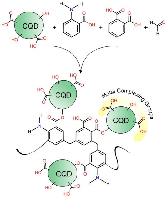 Condensation polymerization pathway incorporating anthranilic acid with carbon quantum dots (CQD), highlighting the metal ion complexing groups (adapted from [59]).