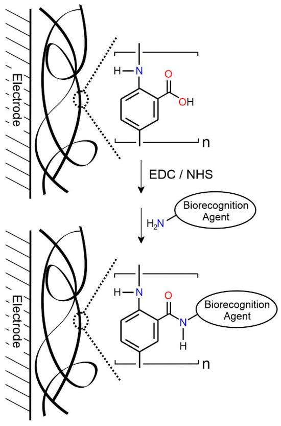 PANI lacks readily accessible functionality that enables covalent modification; hence, the great advantage of copolymerization with anthranilic acid lies in the ability to harness the abundance of carboxylate groups. These can be used as a facile means of tethering other molecular species to the film post polymerization. This is normally achieved using conventional EDC/NHS carbodiimide coupling procedures to activate the COOH group, preparing it for attack by an amino group from the proposed pendant molecule. The basic reaction scheme is highlighted in Figure 10. It is important to note that this approach has been successful in harnessing a variety of receptors—both chemical and biological.