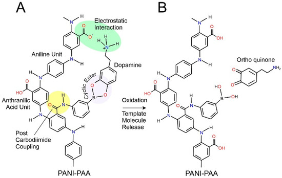 While the strategy devised by Hrichi and colleagues (2017) constitutes a relatively generic approach to MIP formation [67], an earlier approach by Gu et al. (2013) employed a more sophisticated system for dopamine detection involving the immobilization of functional groups possessing greater selectivity for the target [69]. In this case, 3-Aminophenylboronic acid was bound to a chemically polymerized PAN-PAA film through EDC/NHS carbodiimide coupling, as indicated in Figure 11A. It was envisaged that the subsequent attachment of the pendant B(OH)2 groups would be capable of reversibly binding dopamine. The formation of stable cyclic esters between boronic acid groups and 1,2-diols is well known. Template release in this case was achieved through the facile electrochemical oxidation of the boronic-acid-bound dopamine to the corresponding 1,2-quinone species (Figure 11B). Here, the COOH group of the PAA component was critical in enabling the processability of the polymer network as well as in providing a covalent tether for the attachment of the boronic acid group. The covalent imprinting process adopted by Gu and colleagues is reported to allow a more homogeneous distribution of binding sites through the combination of specific (cyclic ester) functionality and electrostatic/H bonding providing cavities with better selectivity over the simpler electro-polymerized templating system.
