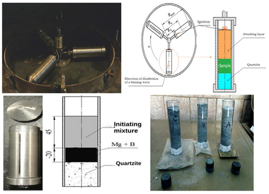 As the magnesium and boron system was weakly exothermic, we needed to provide an additional external source of energy to initiate the process of solid-state synthesis. The following composition was used as the additional initiating mixture: 55 wt.% of CuO + 12 wt.% of Al + 33 wt.% of Al2O3. Thus, the overall weights of the components were given in Table 1. The high-temperature centrifuge (Figure 1) comprised the following: A shaft installed engine, crosspiece with three metal sleeves fixed on it and balanced at a 1200-degree angle, crucibles installed inside these sleeves and covered from both sides, current collectors contacting with a brush assembly, and an ignition spiral. The crucibles were 35 mm diameter and 130 mm long quartz tube glasses.