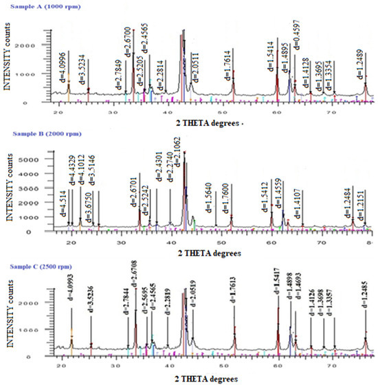 According to the results of the X-ray phase analysis of the synthesized samples (Table 2, Figure 2), the main goal of the experiment was achieved as follows: The magnesium diboride phase (about 61–70 wt.%) was obtained during the solid-state process under centrifugal acceleration. The whole process lasted for approximately 0.8 s. In addition to MgB2 main phase, the following phases were formed: MgO (16–22 wt.%), Mg, and MgB4. The intermetallic phases, CuMg2 and AlB2, were also identified in small amounts, where most of them were found on the surface of the sample. As can be seen from Table 2, when we increased the rotation speed up to 2500 rpm, the yield of the superconducting phase (MgB2) in the sample reduced. It was predicted that as the speed of rotation of the centrifuge increased the temperature in the reaction zone would also increase. The initial powders (magnesium and boron) had interacted with the initiating mixture and formed an intermetallic phase (CuMg2, AlB2). In this case, it might also be that fewer magnesium and boron atoms were left for the chemical interaction to form the MgB2 phase.