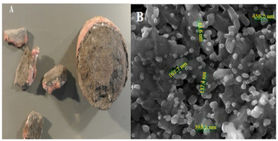 External appearance and microstructure of Sample B after synthesis in the high-temperature centrifuge. (A) General photo; (B) Microphotography.