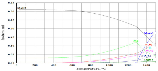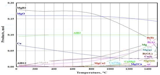The thermodynamic simulation results, which were plotted by means of the HSC Chemistry 6.12 software, are shown in Figure 5 and Figure 6, respectively, for both the Mg + B and Mg + B and CuO + Al + Al2O3 interface systems. It is well known that the Mg + B system is exothermic. The amount of MgB2 phase decreased with increasing temperature. At temperatures of greater than 1300 °C, because of the possible evaporation of the Mg, some B remained in the elemental state, in the forms of amorphous boron [B(A)], beta-rhombohedral boron [B(B)], and glassy structure [B(GL)]. Moreover, because of the boron phase-rich system, the formation of boron-rich magnesium (e.g., MgB4) was promoted.