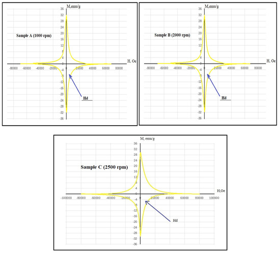 where Jc is the critical current density of the samples, and d is the average particle size. ΔM is the difference in the decrease and increase of the magnetization curve, determined by the magnetic hysteresis (Figure 7). The values of the critical current density of magnesium diboride synthesized at different rotational speeds in the self-magnetic field were assessed using this formula.