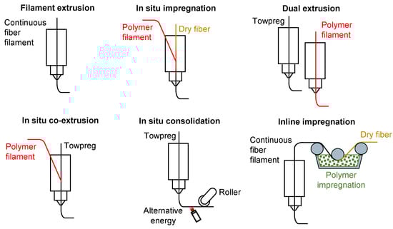 Figure 1 illustrates AM methods in which cFs are processed for component reinforcement. There is a possible classification according to the time and place of contact between the fibers and the melt [22]. The filament extrusion process uses cF-reinforced thermoplastic pre-impregnated filaments, known as towpregs. During extrusion, the towpreg is heated in the print head, the matrix is melted, and then, it is deposited layer by layer [23,24]. At the in situ impregnation process, dry cFs and a polymer filament are introduced separately into the print head. By heating, the polymer is melted, the cFs are impregnated, and then, they are deposited on the build platform [12,24]. In the dual extrusion process, a cF towpreg and a thermoplastic filament are deposited on the build platform through separate print heads [12,24]. The in situ co-extrusion process is characterized by the separate supply of the polymer filament and towpreg to the print head. In the print head, the towpreg is impregnated with the polymer matrix [25]. In situ consolidation is a scaled-down version of an Automated Tape Laying (ATL) process for thermoplastics. Pre-made towpregs or prepreg tapes are consolidated during and after deposition by applying heat [26]. At inline impregnation, dry fibers are pre-impregnated outside the print head, then transported into the print head and subsequently deposited [22].