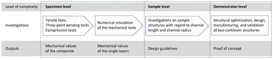 The research program for the development and validation of the novel method is shown in Figure 2. The investigations start at the specimen level. The level of geometric complexity of the sample structures is subsequently increased, and finally, a proof of concept is provided by means of demonstrators.