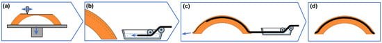 The described cF-AM methods deposit the fibers during the AM process mainly parallel to an even building plate. The in-plane deposition does not allow for the orientation of reinforcing material in a three-dimensional direction. Additionally, the deficiency of the layer interface strength in the mounting direction could not be improved either. There is a need for AM methods and design approaches that enable cF composite reinforcements in a three-dimensional curved (variable–axial) way, independently of the AM mounting direction. A variable–axial orientation of the reinforcement fibers offers the advantage that mechanical loads result in a more uniform distribution of stresses among the reinforcement fibers, while the matrix material is subjected to lower stresses. The high specific stiffness and strength of the fiber materials can consequently be optimally utilized. A significant reduction in material usage and an increase in lightweight construction are demonstrated by existing FRP processes that enable variable–axial fiber orientations (e.g., Tailored Fiber Placement), in contrast to conventional processes with multi-axial layering [27]. In AM, two-stage manufacturing processes have the potential to meet this demand by decoupling the integration of a continuous fiber-reinforced polymer (cFRP) from the AM process. One example is composite structures, where thermoplastic pre-impregnated unidirectional tapes are melted onto a polymer basic structure fabricated using an extrusion-based AM process [28,29].