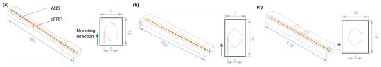 Reinforced specimens for determining mechanical properties consisting of additively manufactured basic structure (ABS) and cross-sectional geometry in the measuring area with drop-shaped channel for integration of cFRP (cF + epoxy). (a) Tensile specimen based on ISO 527-2 standard [34] type 1B. (b) Three-point bending specimen based on EN ISO 14125 standard. (c) Compression specimen based on EN ISO 14126 standard.