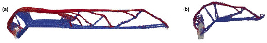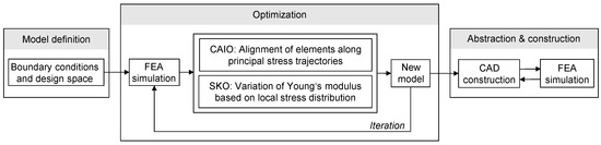 In addition to the separate topology and fiber orientation, the two optimization methods (SKO and CAIO) were programmed as a combined method based on the program blocks of both methods (Figure 6). In each iteration step, the updates of both methods are performed on the same model. This requires minor adaptations in the SKO method: To account for the orthotropic material properties during SKO, only Young’s modulus in fiber direction Ex was used in the update rule (Section 2.5.1, Equation (1)). As in the pure SKO method, 10 discrete materials were used. As material properties, the Young’s moduli in all directions were interpolated towards , meaning that the material with the minimum Young’s modulus has isotropic material properties and, thus, saves computing time during the CAIO part, as no fiber realignment is performed in this regions. Despite the orthotropic material properties, the von Mises stress was chosen as the characteristic stress σ for the material variation during SKO: