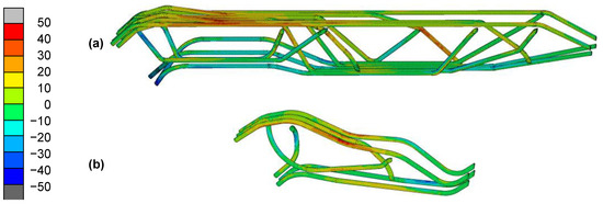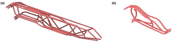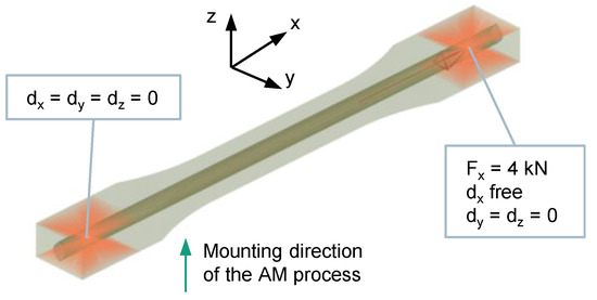In order to validate the generated CAD models, the numerical tool for fiber orientation was extended so that it could implement a specified fiber orientation along the fiber-carrying channels. This has the advantage that compressive- and tension-dominated areas can still be identified, and the corresponding elements can be assigned the compressive or tensile modulus. The material property of the surrounding channel forming matrix was chosen according to the experimentally determined mechanical values in Section 3.2.5. Both demonstrator models, the long version (700 mm) and the short one (320 mm), were loaded in the same way.