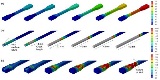 FEA results for (a) displacement in the x-direction [mm], (b) contact traction [N], and (c) principal major stress of additively manufactured basic structure [MPa] show initial crack and crack spreading at interface between cFRP and ABS.