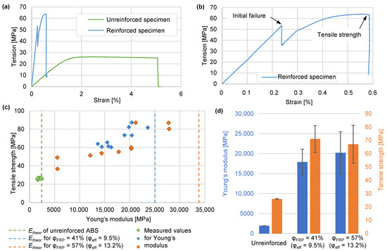 Evaluation of tensile tests. (a) Exemplary stress–strain curves on unreinforced and reinforced specimens. (b) Detailed stress–strain curve of exemplary reinforced specimen. (c) Individual measured and theoretically expected Young’s moduli and tensile strengths. (d) Summary of the experimentally determined values with coefficients of variation.