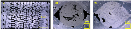Micrographs of specimen (air inclusions in black). (a) Porosity due to layer-by-layer deposition of the polymer melt. (b) Reinforced specimen with low mechanical properties due to large air inclusions, especially at the channel wall. (c) Reinforced specimen with high mechanical properties due to good impregnation quality and good accumulation of the cFRP on channel wall.