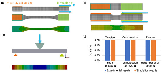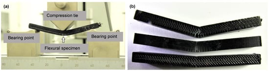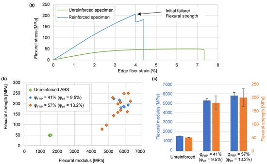 Tensile, compression, and flexure specimens were designed in accordance with the current polymer testing standards with production-related adaptations (Figure 4). In each case, the channel shape was selected in a drop shape to eliminate the need for an internal supporting structure in AM. Reinforced specimens with a channel diameter of 5 mm each were manufactured, and the cFRPs were inserted with FVRs φFRP of 41% and 57%, respectively. The unreinforced specimens had the same outer contour as the reinforced specimens, but the cross-section was closed (without channel). The mechanical tests were carried out with the Zwick/Roell Inspekt 100 kN universal testing device at 23 ± 2 °C and 50 ± 10% rH. The tensile tests were performed in accordance with the ISO 527-4 standard [31]. The speed of testing was 1 mm/min up to 0.3% and 10 mm/min after 0.3% elongation. The three-point bending tests were carried out according to the EN ISO 14125 standard [32]. The span was 80 mm, and the speed of testing 1 mm/min. The compression tests were in accordance with the EN ISO 14126 standard [33] method 1. The speed of testing was 1 mm/min. The material constants listed in Table 1 were extracted from the mechanical tests.