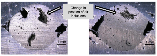 Figure 12 and Table 4 show the results of the tensile tests. The Young’s moduli of the unreinforced specimens determined experimentally are lower than those predicted according to the data sheet, which is a consequence of air inclusions due to the layer-by-layer deposition during the AM process (Figure 13). Consequently, the Young’s moduli of the reinforced specimens are also lower than the previously theoretically determined values, with additional air inclusions in the matrix of the cFRP showing stiffness-reducing effects. Nevertheless, it is confirmed that the reinforced specimens exhibit significantly higher mechanical properties than the unreinforced specimens. The stress at initial failure of the reinforced specimens is 2.7 times higher than the tensile strength of the unreinforced specimens, and Young’s modulus was increased by a factor of 9.1.