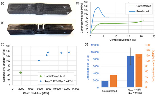 A representative stress–strain curve of an unreinforced and a reinforced specimen is shown in Figure 12. The cFRP results in a significant increase in stiffness and strength. A detailed analysis of the reinforced specimen shows a drop in the stress–strain curve even before the maximum stress is reached (successive failure). This drop in the stress–strain curve indicates the initial failure. Parts of the matrix system detach from the channel wall, and the load is transferred to still-intact interface regions between the channel wall and the cFRP. Subsequently, the structure fails completely.