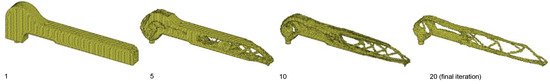 To reduce the computing costs, Young’s modulus was cut to the range Emax/1000 ≤ E ≤ Emax and rounded to 10 discrete, equidistant elastic modulus gradations. The design proposal resulting from the optimization is made visible at the end by hiding all elements with the low Young’s modulus E = Emax/1000.