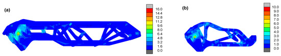 The first step in creating the finite element model was to define a geometry with the maximum permissible installation space in a common CAD system (here: Autodesk Inventor Professional 2021). The geometry was loaded into the preprocessor and meshed there with four-node linear isoparametric tetrahedron elements using linear interpolation functions, resulting in 212,404 elements and 40,641 nodes (Figure 7). The material properties were applied according to the results of material characterization (Section 3.2.5) using the anisotropic mechanical values of the cFRP for tension and compression. The boundary conditions were applied with point loads on 78 nodes on the tip of the cantilever, resulting in a total load of −257.75 N in the x- and y-directions, respectively, and a fixation at the base.