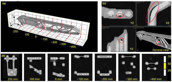 CT analysis of demonstrator cantilever. (a) General view with YZ cutting planes. (b) CT images on selected YZ section views. (c) Representative CT image at an exemplary deflection point with marked air inclusion in channel radius.
