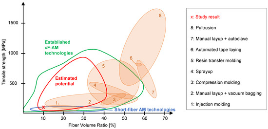 FVR and tensile strengths achievable with conventional FRP processes, short-fiber-reinforced AM, and established cF-reinforced AM methods (inspired by [21,23]). Assessment of the study results shows that the novel method is currently still at a lower performance level. However, a significant increase is expected due to an improvement in interlaminar strength.