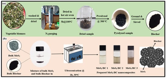 Apart from energy storage applications, MoS2/BC NCs were also synthesized for different applications such as adsorption, photocatalytic degradation of organic pollutants, and water remediation [,,,,]. All the reported methods for the preparation of MoS2/BC NC so far demand a complex bottom-up method for the synthesis of the MoS2 nanomaterial and high temperature for the activation of biocarbon, thus they are very time consuming. In this paper, we have demonstrated a facile, time-efficient, sustainable, and eco-friendly top-down method for the preparation of a MoS2/BC NC for the first time through an aqueous phase exfoliation of MoS2 and BC derived from household vegetable waste. The prepared NC was found to exhibit interesting and superior properties in a synergistic way compared to pristine MoS2 NSs and pristine BC, and the findings of the study are presented in the following sections.