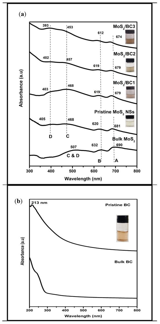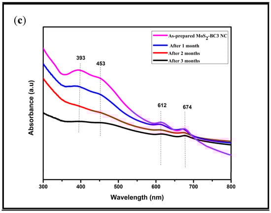 The UV-Vis spectrum was recorded for MoS2/BC1, MoS2/BC2, MoS2/BC3 NCs, pristine MoS2 NSs, and pristine BC. Generally, the absorption spectrum of bulk MoS2 has four excitonic peaks in the region of 600–700 nm and 400–500 nm, which are designated as A and B and C and D peaks, respectively []. As it reduces to few-layered NSs upon exfoliation, the reduction in thickness is indicated by a blue shift of all four peaks and the C and D peaks become resolved. In the exfoliation methods reported earlier, this kind of shift and resolution in the peaks happened after long hours of sonication (8 h) []. In the present study, the formation of few-layered NSs occurred within 2 h, as indicated by the shift and resolution of peaks in the UV-Visible spectrum (Figure 2a) when bulk MoS2 was exfoliated along with BC. The excitonic peaks of the three NCs (Table 1) exhibited a gradual blue shift of the A and B peaks with peak-to-peak separation of ~62 nm, and well-resolved C and D peaks upon the addition of BC compared to the pristine MoS2 NSs. An increase in the amount of BC beyond 10:3 in the NCs showed no significant shift in the excitonic peaks; hence, the optimum ratio of MoS2: BC for the effective exfoliation of MoS2 was fixed at 10:3. Also, the bulk BC did not show any characteristic peaks in the UV-visible region []. Upon exfoliation for 2 h, the absorption peak of pristine BC appeared at 213 nm (Figure 2b), which was ascribed to the presence of aromatic carbon structures [] in the exfoliated BC. The drastic reduction in the exfoliation time for the formation of NSs clearly indicates that added BC plays a vital role in the formation of NSs. Once the layers of MoS2 become separated from the bulk by ultrasonication, they are slowly adsorbed on the surface of the BC present in the medium, which prevents the restacking and agglomeration of the formed NSs. Thus, the gradual addition of BC facilitates a facile exfoliation of MoS2 and enhances the formation of few-layered MoS2 NSs within a short duration, especially in MoS2-BC3 NC. Also, the stability of the prepared NC (MoS2-BC3) was monitored using UV-Vis spectroscopy and the spectrum was recorded over a period of 3 months (Figure 2c). The characteristic peaks of MoS2 (A, B, C, and D) remained unaltered for one month and exhibited a gradual shift in the peaks thereafter, indicating the agglomeration of the nanosheets.