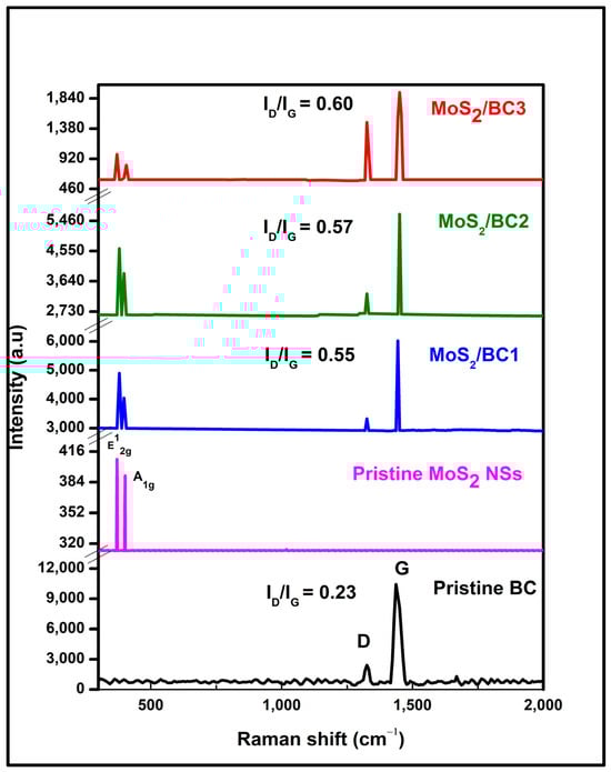 Raman spectra of pristine BC, pristine MoS2 NSs, MoS2/BC1, MoS2/BC2, and MoS2/BC3 NCs.