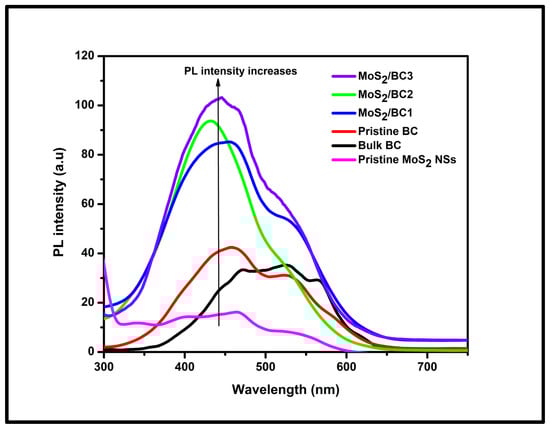 The PL spectroscopy was employed to study the quantum confinement effects and the defects present in the prepared samples (Figure 4). The PL spectra for all the samples were recorded at excitation wavelengths corresponding to their ultraviolet absorption peaks. Bulk and pristine MoS2 NSs did not show any PL emission peaks as reported by [], whereas bulk and pristine BC with an excitation wavelength of 200 nm exhibited broad emission peaks at 527 and 460 nm due to the presence of structural defects in the extended conjugation of the carbon network. A large redshift with enhanced PL intensity was observed in all the three NCs, MoS2/BC1, MoS2/BC2, and MoS2/BC3, at 432, 453, and 445 nm, respectively, at their corresponding excitation wavelengths of 233, 245, and 254 nm. Hence, with the increase in the amount of BC in the NCs, the PL property also increases, and the increase in the PL intensity indicates the presence of more defect states in the NCs due to the strain created at the interface of the carbon surface and the MoS2 NSs []. Thus, the luminescence property of pristine BC is very much enhanced in the presence of MoS2 NSs in the NCs, thus implying the good synergy between BC and MoS2.