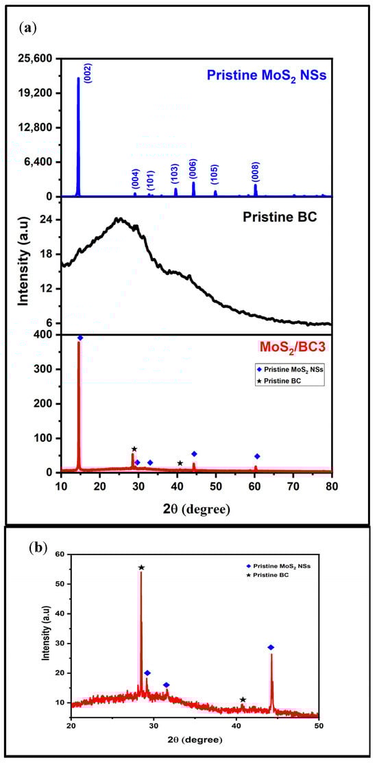 The XRD spectrum was recorded for MoS2-BC3 NC, pristine BC, and pristine MoS2 NSs (Figure 5). The XRD diffraction patterns of pristine MoS2 NSs show peaks at 14.38°, 29.01°, 32.54°, 33.63°, 35.78°, 39.59°, 44.21°, 49.90°, and 60.21°, which were assigned to the lattice planes of (002), (004), (101), (103), (006), (105), and (008), respectively []. These diffraction peaks are indexed and match well with the hexagonal MoS2 (JCPDS No. 37-1492). The pristine BC showed two broad peaks at 25.3° and 43.2° due to the presence of an amorphous structure arising from disordered carbon atoms [], while in MoS2/BC3 NC, these peaks shifted to 28.01° and 40.69° (Figure 5b) due to the presence of MoS2 on the surface of the BC. In addition to this, the XRD pattern of the MoS2/BC3 NC shows the peaks of pristine MoS2 NSs with a significantly reduced intensity peak of a (002) plane at a lower 2θ value (13.84°) due to the formation of few-layered NSs in the NC. Thus, the amorphous nature of the BC present, along with crystalline MoS2 NSs, enhances the overall surface area of the prepared NC.