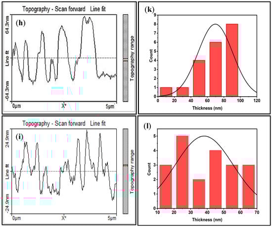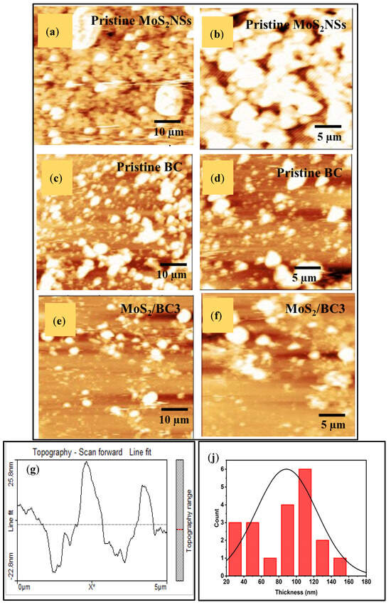 AFM images of (a,b) pristine MoS2 NSs, (c,d) pristine BC, and (e,f) MoS2-BC-3 NC; (g–i) height profiles and (j–l) thickness histograms at 5 µm scale of pristine MoS2 NSs, pristine BC, and MoS2-BC-3 NC. [X indicates the distance measured from 0 µm to 5 µm].