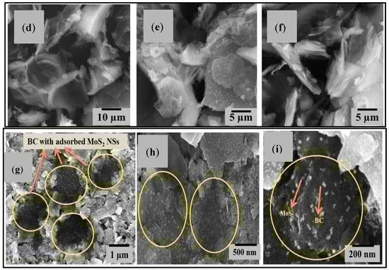 The FESEM images reveal the morphological features and the EDX spectra provide the composition of the materials (Figure 7). FESEM images recorded at various magnifications showcase the micro- and nano-scale surface morphology of the MoS2/BC3 NC, pristine MoS2 NSs, and pristine BC. FESEM images of the pristine MoS2 NSs show bundles of layered structures (Figure 7a–c) and the images of the pristine BC (Figure 7d–f) revealed thick sheet-like morphology with porosity. The FESEM images of the as-prepared MoS2/BC3 NC with different magnifications (Figure 7g–i) show a scattered sheet-like morphology with MoS2 (bright tiny spots) on the surface of the BC (dark regions).