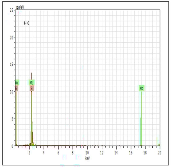 Among the various counter materials that are added to MoS2, carbon-based materials such as graphene, reduced graphene oxides, carbon nanotubes, and carbon nanofibers, are considered to be ideal as these materials exhibit distinct properties such as a porous structure and large surface area, which improves the electrochemical properties of pristine MoS2 []. There are several reports on MoS2/carbon-based composites such as MoS2/carbon, MoS2/graphene, MoS2/graphene oxide, MoS2/reduced graphene oxide, MoS2/carbon nanotubes, MoS2/carbon nanofibres, and MoS2/graphitic carbon nitrides for various applications like photocatalytic degradation, biosensors, energy conversion, and storage applications [,,,]. In the recent past, combining carbon materials derived from biosources with MoS2 has gained interest due to its eco-friendly approach to converting biowaste to a value-added product for suitable applications. The incorporation of carbon-based materials such as nanocomposites into MoS2 can be considered an environmentally sustainable method compared to conventional carbon-based materials like graphene or carbon nanotubes [] which involve hazardous chemicals, high cost, complex synthesis procedures, and limited scalability.