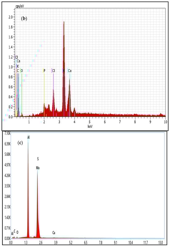 The EDX spectra of pristine MoS2 NSs show the presence of molybdenum and sulfur, whereas the pristine BC shows carbon, oxygen, calcium, and potassium. The as-prepared MoS2/BC3 NC shows the presence of molybdenum, sulfur, carbon, oxygen, and aluminum (due to aluminum foil coating). The results provided proof of the incorporation of BC into the as-prepared MoS2/BC3 NC (Figure 8a–c).