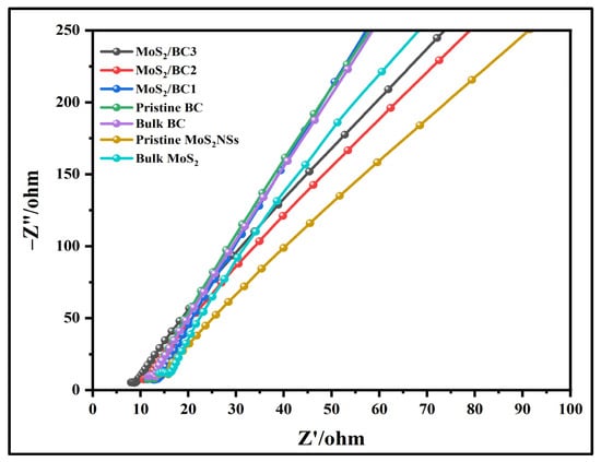 Nyquist plots of EIS for bulk MoS2, pristine MoS2 NSs, bulk BC, pristine BC, MoS2/BC1, MoS2/BC2, and MoS2/BC3 NCs.