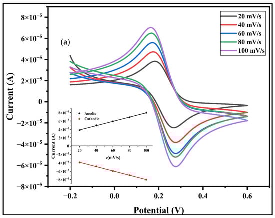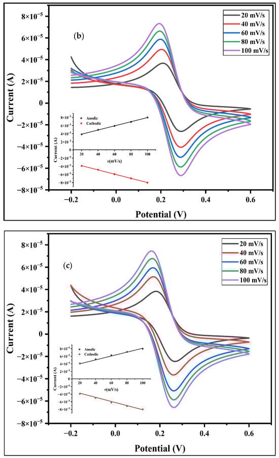 The CV technique was used to study the electrochemical properties and redox behavior of the modified electrode surfaces. Since MoS2/BC3 NC shows low charge transfer resistance and solution resistance, the CV profile of the GCE-modified electrode with MoS2/BC3 was recorded and compared with the pristine BC and pristine MoS2 NSs in 0.1 M KCl containing 5 mM of Fe(CN)6 3−/4− at different scan rates (20, 40, 60, 80, and 100 mVs−1) (Figure 10a–c). The current response of CV enhances when increasing the scan rate due to rapid diffusion of the analytes at a faster scan rate. A linear relationship between the anodic and cathodic peak currents at different scan rates indicates a diffusion-controlled reaction of the prepared electrode material. The surface area of the modified electrodes was calculated using the peak current from the redox reactions of Fe(CN)6 3−/4− at a scan rate of 50 mV/s using the diffusion coefficient values in the Randles–Ševčík equation. The calculated electrochemical surface areas for the MoS2/BC3 NC, pristine BC, and pristine MoS2 NSs are 0.074, 0.07, and 0.069 cm2, respectively. The result shows that the incorporation of highly porous and amorphous BC prevents restacking of the layered MoS2 NSs, thereby increasing the surface area which in turn increases the peak current of the MoS2/BC3 NCs by providing more active sites for electrochemical reactions.