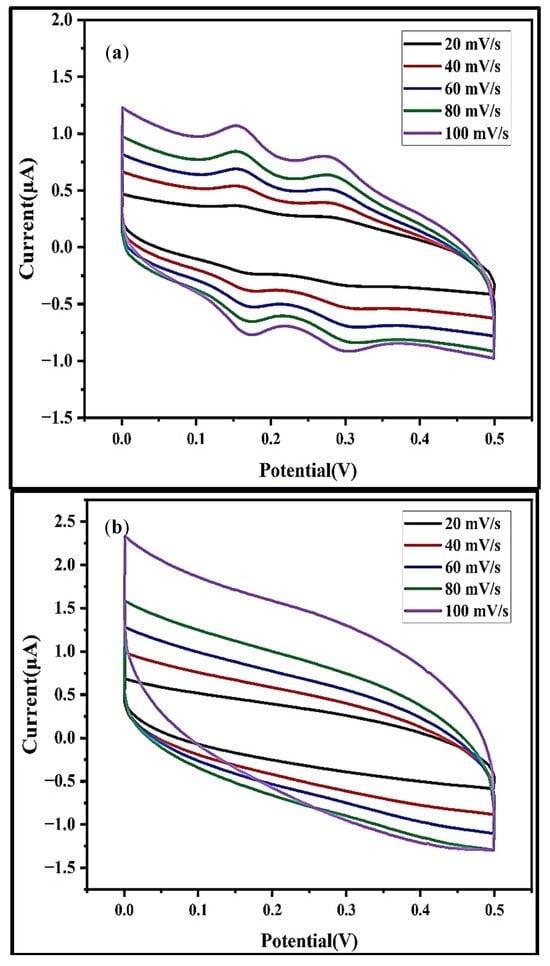 The GCE surface was 3 mm diameter and was cleaned using 0.3 μm and 0.05 μm of micro polish alumina, rinsed with double distilled water, then ultrasonicated in acetone for one minute. After ultrasonication, the electrode was allowed to dry at room temperature. Then, 5 μL of the prepared samples were drop cast onto the pre-cleaned GCE surface and dried at room temperature. The electrochemical measurements of the samples were performed using a CHI model 660C (Austin, TX, USA) electrochemical workstation in 1 M H2SO4. The experiments were performed using a three-electrode cell set up with a platinum wire as the counter, Ag/AgCl as the reference, and modified glassy carbon as the working electrodes. Cyclic voltammetry (CV) studies were carried out in the range of a 10–100 mV/s scan rate and electrochemical impedance spectroscopic (EIS) studies were in the range of 100 kHz–0.1 Hz at the open circuit potential, with an AC amplitude of 5 mV. The surface areas of the modified electrodes were calculated using the Randles–Ševčík equation, Ipa = 2.69 × 105 n3/2 ACoD1/2ν1/2; where Ipa represents the peak current, n is the number of electrons transferred, A is the surface area of the electrode, Co is the concentration of the electroactive species, D is the diffusion coefficient (6.69 × 10−6 cm2 s−1), and ν is the scan rate. The specific capacitance (Cs) of the prepared material was calculated from the CV curve using the following equation: