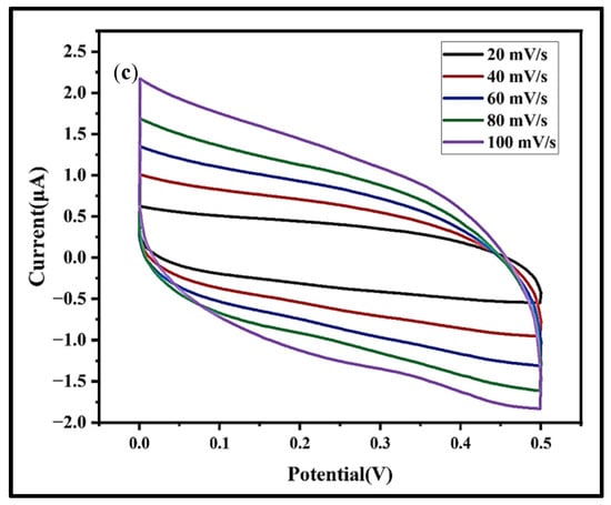 The capacitive behavior of the prepared materials was analyzed by recording the CV profiles of the modified electrodes with MoS2/BC3 NC, pristine BC, and pristine MoS2 NSs in the potential window of 0–0.5 V at different scan rates (20, 40, 60, 80, and 100 mVs−1) in 1 M H2SO4. The MoS2/BC3 and pristine BC-modified electrodes display quasi rectangular CV curves due to the presence of both the electric double layer and the pseudo capacitive behavior of the modified electrodes. The CV curve of pristine MoS2 NSs shows a pair of faradaic redox peaks due to the electron transfer across the electrode–electrolyte interface, representing the pseudocapacitive nature of pristine MoS2 NSs (Figure 11a–c). The dual structural property of highly porous pristine BC and the layered structure of MoS2 NSs in the MoS2/BC3 NC increased the overall area of the curve, which in turn increased the specific capacitance. The specific capacitance values calculated from the CV curve for the modified electrodes at different scan rates are listed in Table 3. The MoS2/BC3 NC had a higher specific capacitance value of 34 F/g than pristine MoS2 NSs and pristine BC at a scan rate of 20 mVs−1. At lower scan rates, the specific capacitance increased due to the diffusion of a large number of electrolytic ions into the pores of the electrode material over an extended period. The electrochemical studies reiterate the synergy between MoS2 and BC in terms of the improved overall surface areas, electrical conductivity, capacitive behavior, and specific capacitance values. While BC offers electric double-layer capacitance, MoS2 NSs exhibit faradaic pseudocapacitance and when present together, the NC is more suitable for the development of an electrode material for hybrid capacitors.