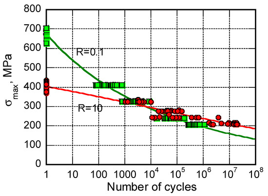 The CA fatigue data under pure tension and compression with equivalent stress ratios R = 0.1 and R = 10, respectively, are plotted in Figure 1 with corresponding curve fitting based on Equation (3). It should be noted that Equation (3) is formally identical in tension and compression fatigue, provided R is substituted by 1/R under pure compression when 1 < R < ∞. The results indicate different material behavior under tensile and compressive loading at low-cycle regimes until approximately 104 cycles of lifetime. Then, the material appears to be more vulnerable to tensile loading patterns.
