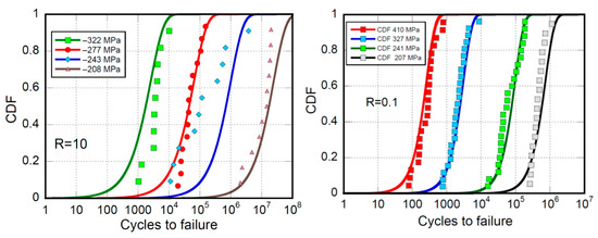 Also, based on the tension and compression model parameters α and β, and the scale and the shape factor of the static strength distribution, γ and δ, reported in Table 4, respectively, the statistical distribution of the fatigue life under given and R can be predicted using Equation (5). Figure 3 illustrates the quality of the statistical lifetime predictions at R = 0.1 and R = 10 compared to the experimental data obtained at different applied peak stresses.