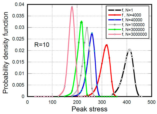 From Equation (5), the probability density function (PDF) at a given elapsed cycle, n, as a function of the maximum applied stress, can be obtained as follows:
